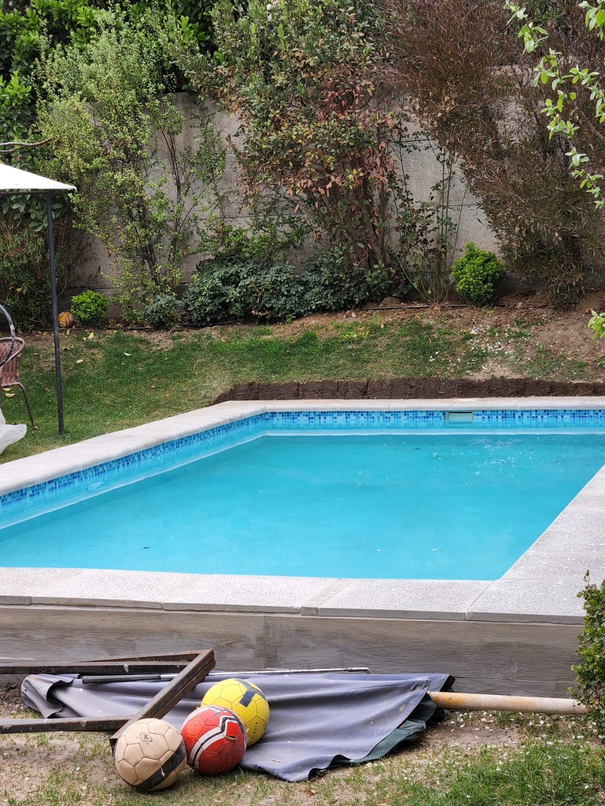 Construcción de piscina elevada con bordes de concreto y revestimiento interior tipo veneciano. Se integró al jardín existente con paisajismo y borde perimetral decorativo.