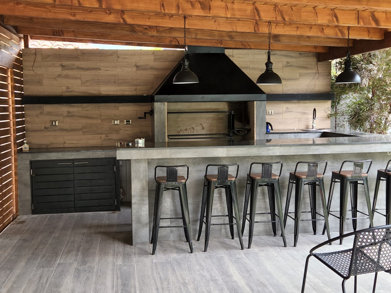 Diseño e instalación de quincho con cubierta de madera a la vista, isla de concreto con comedor integrado, parrilla empotrada y grifería moderna. Espacio funcional para reuniones sociales.